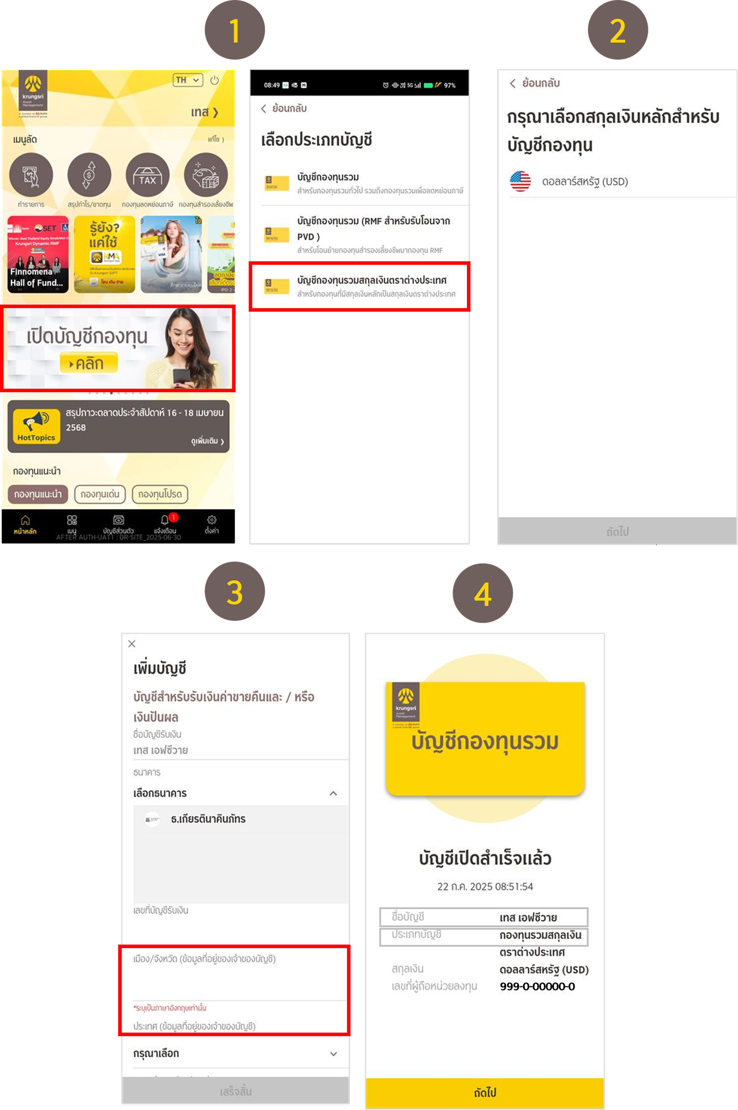 - ขั้นตอนการเปิดบัญชีอื่นๆจะเหมือนการเปิดบัญชีกองทุนรวมทั่วไป ยกเว้น การผูกบัญชีรับเงิน ให้ระบุข้อมูลเมืองและประเทศของผู้ลงทุนเพิ่ม โดยต้องเป็นภาษาอังกฤษเท่านั้น