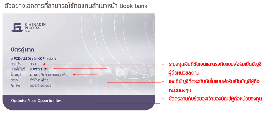 - สกุลเงินของบัญชี FCD จะต้องตรงกันกับของบัญชีผู้ถือหน่วยลงทุน