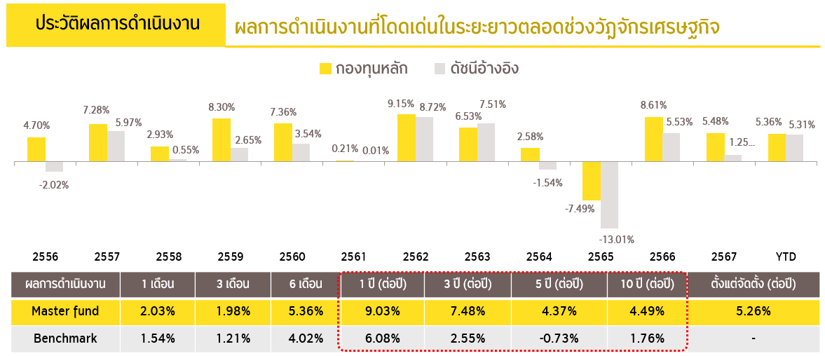 กองทุนหลักมีผลการดำเนินงานย้อนหลังที่โดดเด่นในระยะยาวตลอดช่วงวัฎจักรเศรษฐกิจ รวมถึงเมื่อเทียบกับดัชนีตราสารหนี้ประเภทต่างๆ