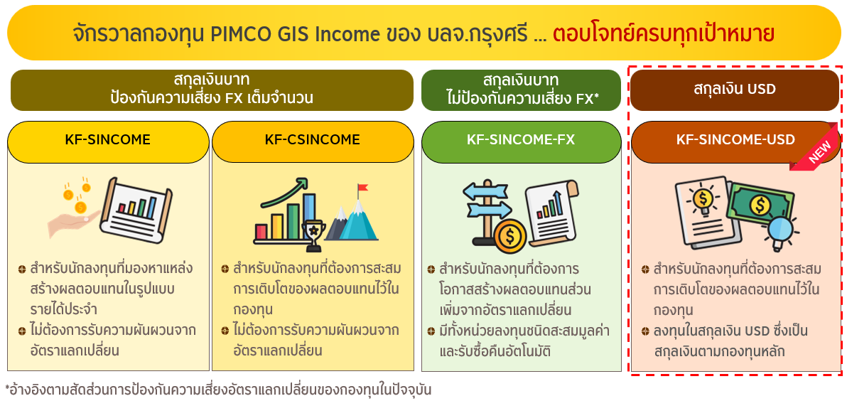 ใหม่! KF-SINCOME-USD กองทุนรวมตราสารหนี้ที่เปิดให้คุณลงทุนเป็นสกุลเงินดอลลาร์สหรัฐ โอกาสรับผลตอบแทนเต็มๆ ใกล้เคียงกองทุนหลักระดับ 5 ดาว* อย่าง PIMCO GIS Income Fund ลดผลกระทบจากอัตราแลกเปลี่ยน และต้นทุนการป้องกันความเสี่ยงค่าเงิน รับมือกับความผันผวนของเศรษฐกิจโลก