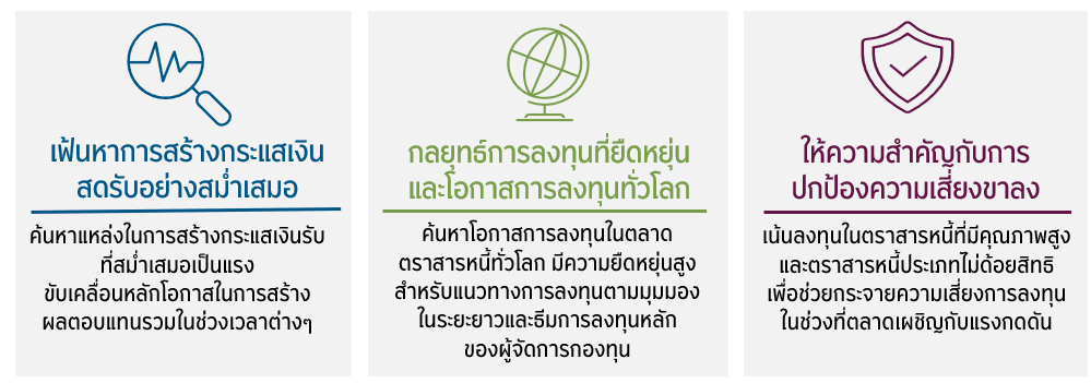 การกระจายการลงทุนในตราสารหนี้หลายประเภท การบริหารอายุเฉลี่ยของตราสารหนี้ในพอร์ตการลงทุนในเชิงรุก และเน้นความสมดุลระหว่างการสร้างผลตอบแทนและการปกป้องเงินลงทุนอย่างยืดหยุ่น ทำให้กองทุนมีผลการดำเนินงานที่ดี และสามารถฟื้นตัวขึ้นได้หลังจากผ่านช่วงวิกฤติต่างๆ พิสูจน์ได้จากประวัติผลการดำเนินงานที่โดดเด่น