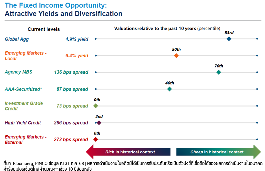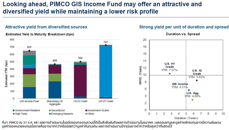 - กองทุน PIMCO GIS Income Fund ใช้กลยุทธ์การลงทุนที่ยืดหยุ่น โดยปัจจุบันให้น้ำหนักในตราสารหนี้คุณภาพสูง โดยเฉพาะพันธบัตรรัฐบาลและตราสารจำนองที่มีรัฐบาลสหรัฐฯ ค้ำประกัน (Agency MBS) ที่ยังคงมีราคาน่าสนใจ ให้ผลตอบแทนเฉลี่ยประมาณ 6% และได้รับการค้ำประกันจากรัฐบาลสหรัฐฯ ในกรณีผิดนัดชำระ เมื่อเทียบกับพันธบัตรรัฐบาล (Treasuries) ที่ให้ผลตอบแทนราว 4% ตราสาร Agency MBS ยังให้ผลตอบแทนส่วนเพิ่มอีก 130–150 bpsพร้อมรักษาสภาพคล่องได้ดี โดยมีอันดับเครดิตเฉลี่ยที่ AA- และผลตอบแทนมากกว่า 6% ทำให้ Agency MBS เป็นตลาดตราสารหนี้ที่ใหญ่เป็นอันดับสองรองจาก Treasuries