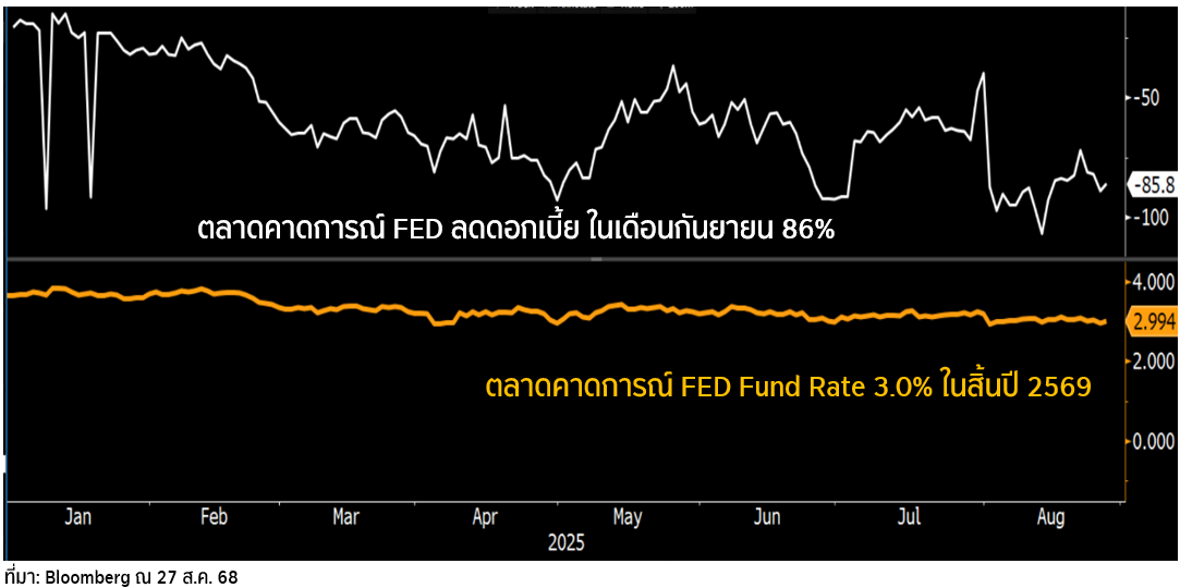 - นโยบายการเงินสหรัฐฯ มีการเปลี่ยนแปลงอย่างมีนัยสำคัญ โดยธนาคารกลางสหรัฐ (Fed) ส่งสัญญาณอาจปรับลดดอกเบี้ย ตลาดคาดการณ์โอกาสสูงถึง 86% ที่จะเริ่มลดดอกเบี้ยภายในเดือนกันยายน 2568 และอาจลดต่อเนื่องถึง 6 ครั้งจนถึงปี 2569 ทำให้อัตรา Fed Funds Rate อาจปรับลดลงสู่ระดับ 3% สะท้อนแรงกดดันจากตลาดแรงงานที่เย็นตัวลง เงินเฟ้อจากภาษีนำเข้า และเส้นอัตราผลตอบแทนพันธบัตรรัฐบาลสหรัฐฯ ที่ชันขึ้น แม้มีความไม่แน่นอน แต่ก็สร้างโอกาสที่น่าสนใจแก่นักลงทุนตราสารหนี้