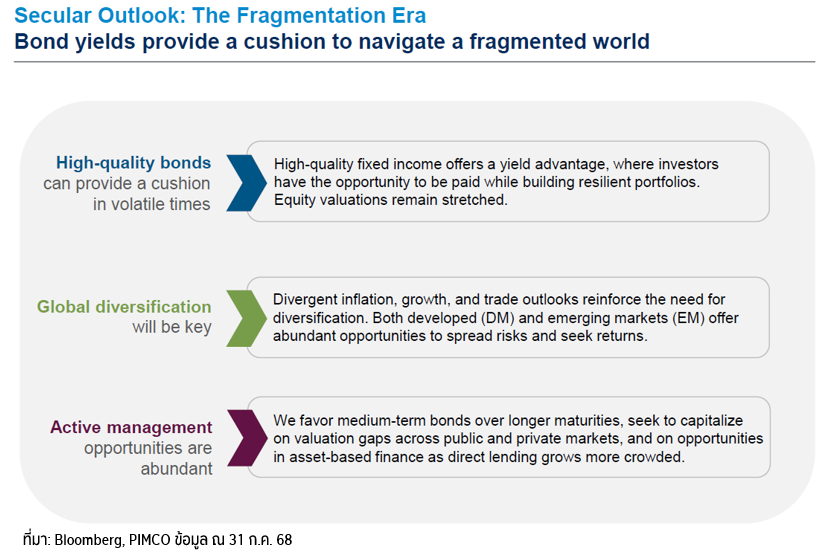 - PIMCO ยังเน้นกรอบการประเมินมูลค่าที่มีวินัย หลีกเลี่ยงการลงทุนในสินทรัพย์ที่ราคาสูงเกินจริง แต่เลือกลงทุนในสินทรัพย์ที่ยังมีราคาน่าสนใจและมีโอกาสปรับขึ้นในอนาคต ด้วยการจัดการ Duration และการเลือกประเภทตราสารหนี้ที่จะลงทุนในเชิงรุก ทำให้กองทุนสามารถสร้างผลตอบแทนสม่ำเสมอให้แก่นักลงทุนแม้ท่ามกลางความไม่แน่นอน