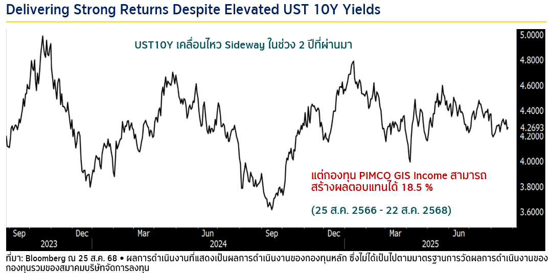 - แม้ความเสี่ยงเงินเฟ้ออาจทำให้การลดดอกเบี้ยช้าลง แต่คุณเกียรติศักดิ์มองว่าเป็นประเด็นระยะสั้น พร้อมย้ำว่าตราสารหนี้ยังคงมอบทั้งอัตราผลตอบแทนที่น่าสนใจและความสามารถในการกระจายความเสี่ยง และชูจุดเด่นของ PIMCO ในการบริหารจัดการความผันผวนได้อย่างมีประสิทธิภาพ โดยในช่วง 2 ปีที่ผ่านมา แม้อัตราผลตอบแทนพันธบัตรรัฐบาลสหรัฐฯ อายุ 10 ปี อยู่ราว 4.2% และราคาแทบไม่ขยับ แต่ PIMCO สามารถสร้างผลตอบแทนได้ถึง 18.5% และเมื่อเปรียบเทียบกับดัชนีมาตรฐาน เช่น U.S. Aggregate Index และ U.S. High Yield Bonds กองทุนของ PIMCO ยังคงทำผลงานได้ดีกว่าและมีความเสี่ยงต่ำกว่า ด้วยกลยุทธ์การจัดสรรเชิงรุกและการลงทุนแบบ Tactical