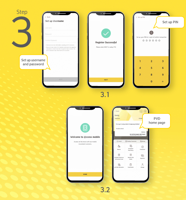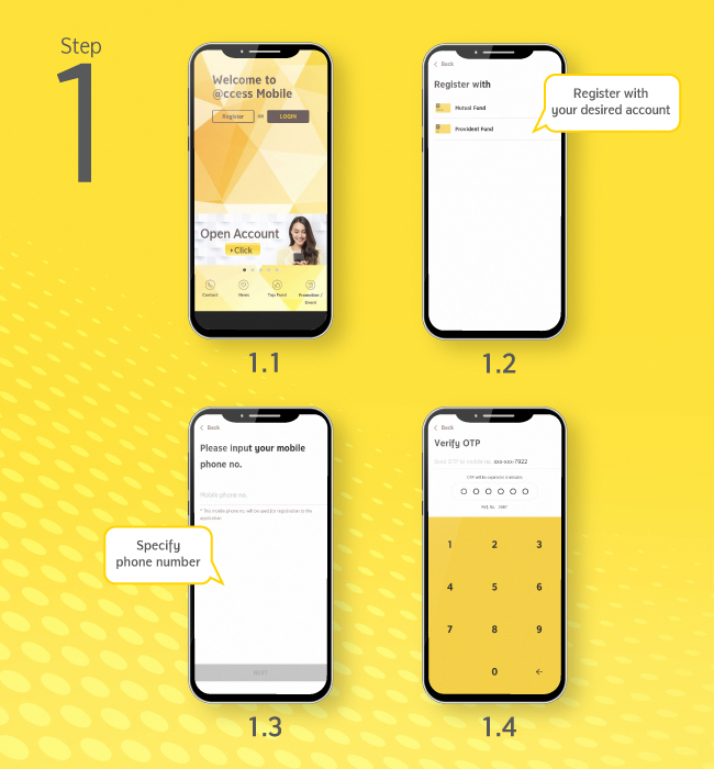 (1) Open application, choose “Register” for the first-time log-in then choose Register with Provident Fund and input mobile phone number and OTP.