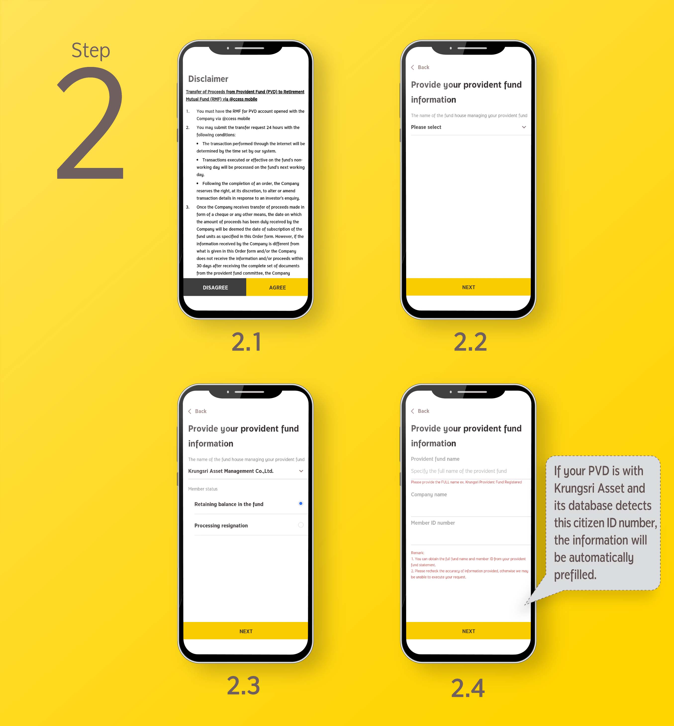 If you want to transfer your money to another asset management company, you have to switch the investment units of all RMFs for PVD to one RMF for PVD and then switch all the investment units out to another asset management company. Switching between RMFs for PVD may incur a fee subject to the policy of each fund but there is no switching-out fee from Krungsri Asset Management to other asset management company.