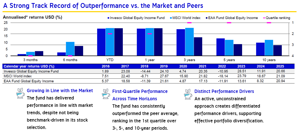 Sources: Invesco as of 31 Dec 2025 | *Returns for periods longer than one year are annualised. | Peer group data is based on Morningstar’s EAA Fund Global Equity Income category | Returns shown are net of management and transaction fees and are presented in USD | Performance shown is based on the Z Share Class, which is offered only to qualified investors in approved jurisdictions, while KF-GEI invests in the C (Acc) Share Class. Both share classes follow the same investment strategy | Returns shown are net of management fees with dividends reinvested | Performance shown represents the performance of the master fund and is not calculated in accordance with the performance measurement standards of AIMC.