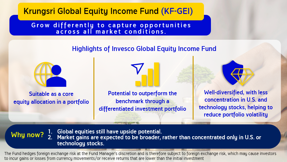 At the seminar “A Different Path to Global Equity Winners", Krungsri Asset Management Company Limited (KSAM), together with Invesco, one of the world’s leading global investment managers, shared experts’ positive perspectives through in-depth analysis of global economic trends and the evolving equity investment landscape amid market uncertainty and geopolitical tensions. The event also marked the launch of a new fund, Krungsri Global Equity Income Fund (KF-GEI), which invests in the master fund, Invesco Global Equity Income Fund that have delivered a strong performance track record. KSAM believes that KF-GEI can serve as a core portfolio for investors, aiming to generate both income and capital growth while helping reduce volatility in a changing economic environment in 2026.