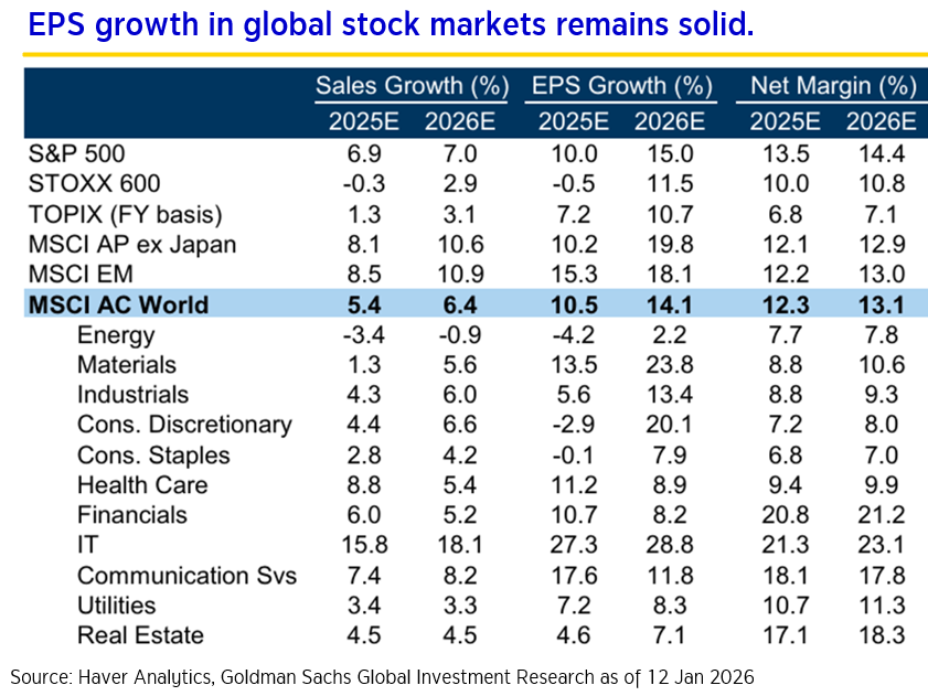 - While market noise is inevitable, the global stock investment remains upward, supported by helpful government policies including the US tax cut, Japan’s stimulus packages, Germany’s defense spending, and the massive wave of AI investment. Economic data remains strong, with the MSCI AC World index expected to see 14% profit growth in 2026, backed by a steady 3.3% global GDP growth forecast from the IMF*. As inflation continues to cool, the environment for risk assets becomes increasingly favorable. However, high valuations could lead to occasional market corrections, though he maintained that such dips represent strategic buying opportunities. (*Source: IMF, World Economic Outlook, Krungsri Research (January 2026)).