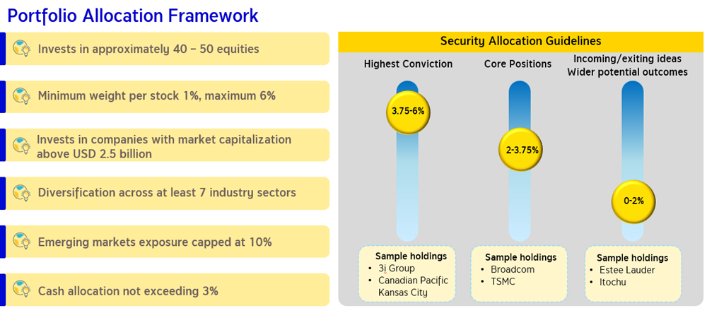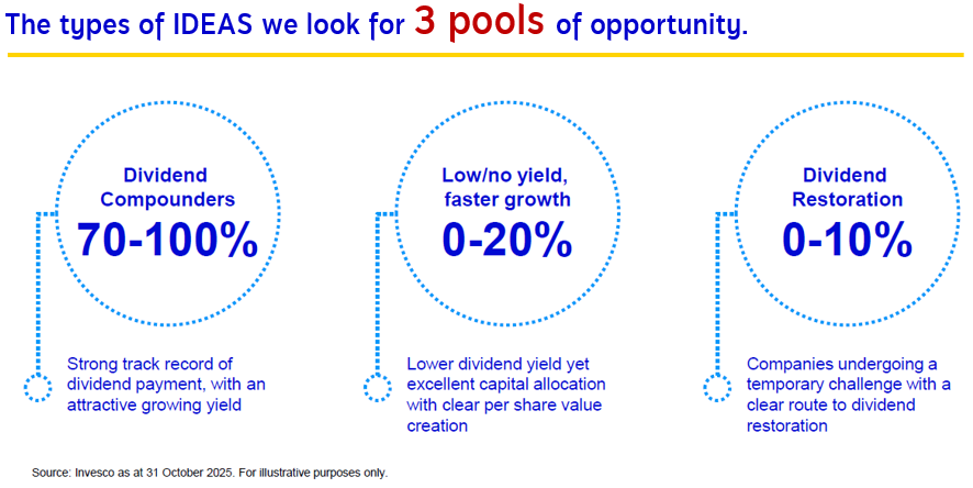 Source: Invesco as of 31 Dec 2025. For illustrative purposes only. Not a recommendation to buy or sell securities. | Investment framework and allocations may change at the fund manager’s discretion. | Industry diversification is based on the Global Industry Classification Standard (GICS), which was developed and is owned by MSCI, Inc. and Standard & Poor’s.