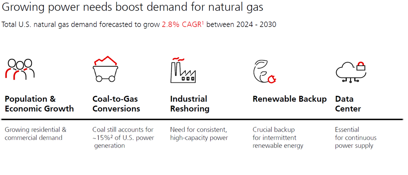 - The focus on Climate Change within the investment strategy emphasizes clean energy infrastructure. Natural gas is expected to play a prominent role as a more efficient energy source compared to alternatives. The US possesses vast natural gas reserves, leading to anticipated significant growth in this sector. Projections indicate a 2.8% annual increase in natural gas demand in the US between 2024 and 2030. This growth is driven by factors such as economic and population expansion, the transition from coal to natural gas, and the need for a stable energy source in various industries.