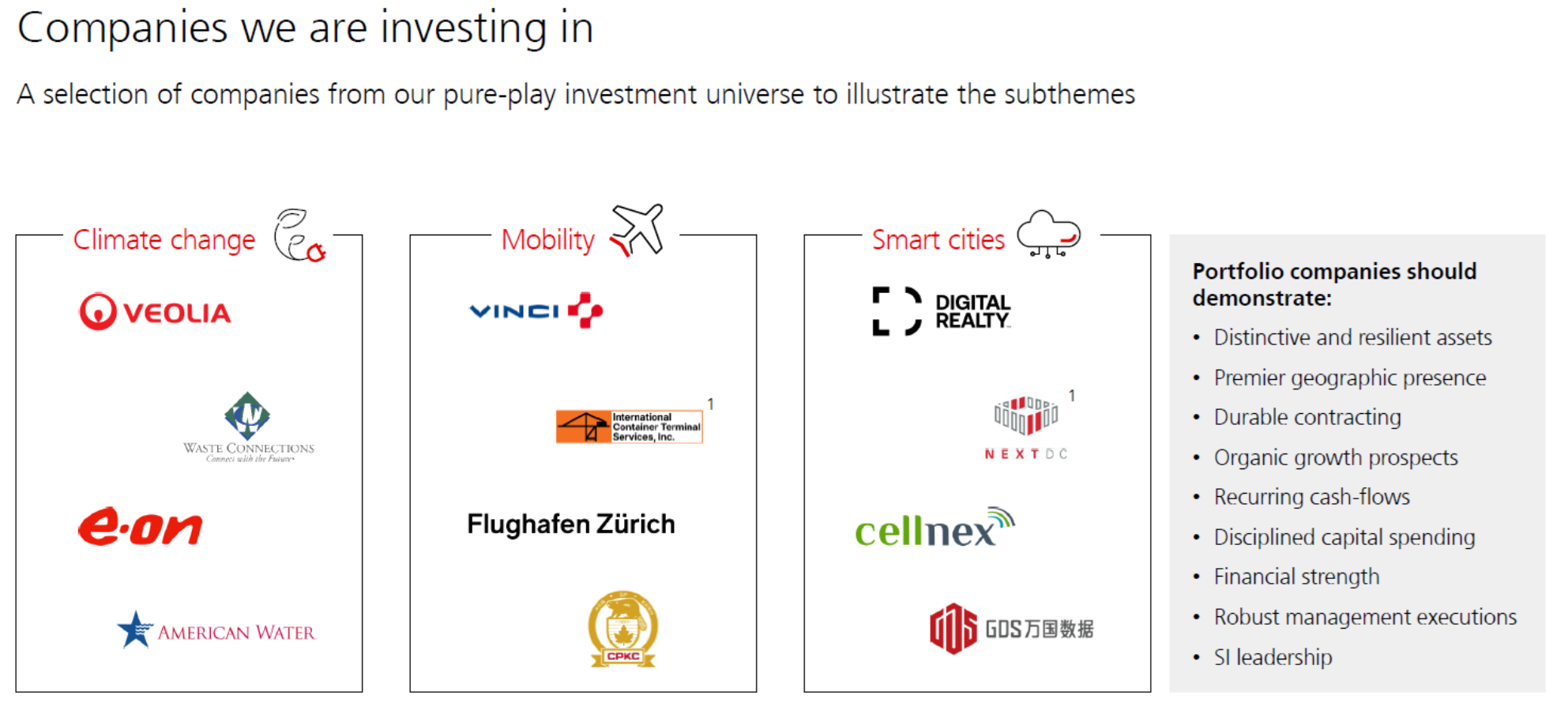 - Other leading companies in which the fund invests under the Climate Change theme include Veolia, a waste and water management company. Under the Mobility theme, investments include Zurich Airport, while the Smart Cities theme features Digital Realty, a top U.S. data center company.