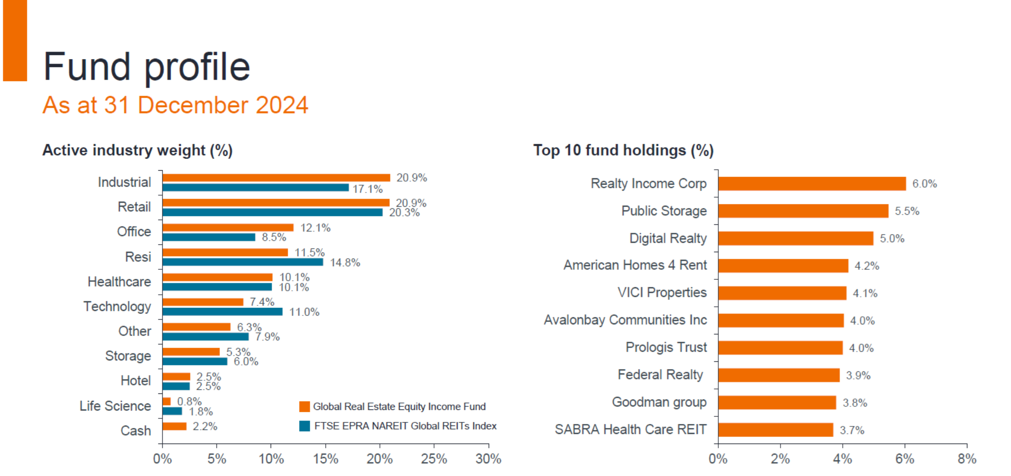 - The fund focuses on investing in high-quality global real estate businesses and REITs, which provide greater ownership rights, can directly manage assets while benefiting from lower financing costs and easier access to capital than other owners of real estate.
