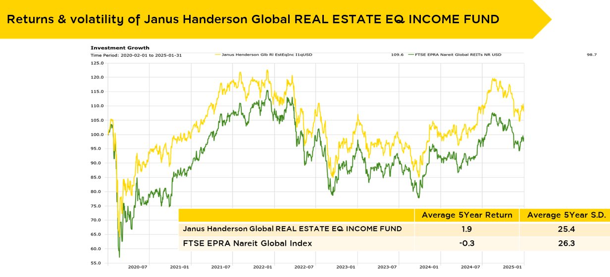 - KFINFRA’s master fund is UBS (Lux) Infrastructure Equity Fund, Morningstar 5-Star rated fund under UBS Asset Management, while KFGPROP’s master fund is Janus Henderson - Global Real Estate Fund under Janus Henderson Investors. Both global funds have consistently outperformed the market for several years. They have extensive experience and expertise in their respective sectors.
