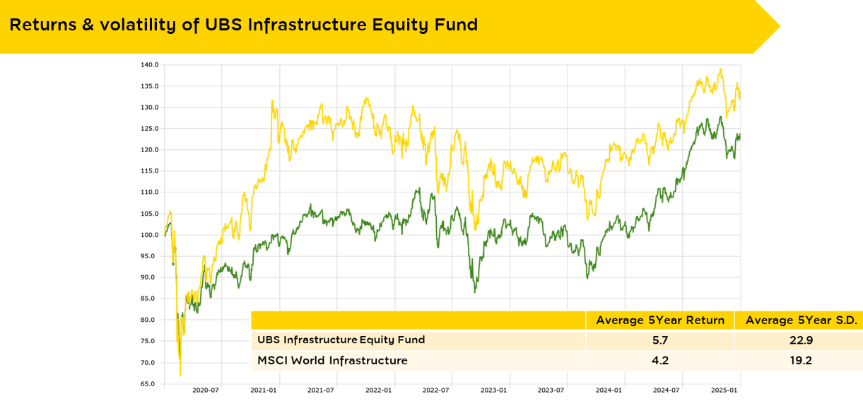 - Infrastructure is a quasi-monopoly business in many sectors, with high entry barriers due to the need for long-term contracts. This translates into consistent cash flow and steady dividend payments, making it a relatively lower-risk investment within equities.