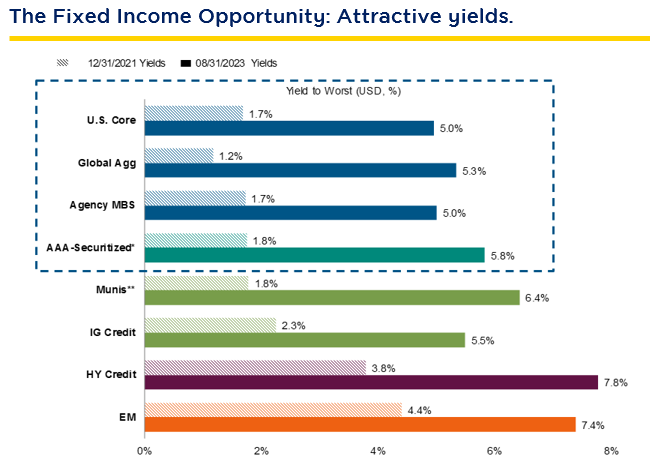 As for investment strategy in fixed-income securities, PIMCO will select assets for investment by considering the market situations and investment opportunities. With current interest rates at high levels, the Fund will focus on longer-term assets to lock in high returns over the long run. Currently, PIMCO’s debt securities of interest are Agency Mortgage-Backed Securities (MBS) that are financial instruments backed by government guarantees. PIMCO believed that they are high-quality debt securities that are relatively safe, with low risk, and still priced at a reasonable level, so they are suitable for investment. Source: Bloomberg, PIMCO as of 31 Aug. 2023 | Index proxies for asset classes displayed are as follows: Agency MBS: Bloomberg MBS Fixed Rate Index (incept: 1/30/76), Munis: Bloomberg Municipal Bond Index (incept: 1/30/80), U.S. Core: Bloomberg U.S. Aggregate (incept: 1/30/76), Global Agg: Bloomberg Global Aggregate USD Hedged (incept: 1/1/99), HY Credit: ICE BofA US HY BB-B Rated Index (incept: 12/31/96), EM: JPMorgan EMBI Global USD Hedged (incept: 12/31/93), IG Credit: Bloomberg US Credit Index (incept: 1/31/73). *AAA-Securitized YTW computed as average of AAA CLOs, CMBS, and ABS from JPMorgan and Barclays. **Municipal yields are the taxable equivalent yield, adjusted by the highest marginal tax rate (40.8%). Unadjusted IG Muni index yield is 3.66% with a change of 260bps compared to 12/31/2021 levels.