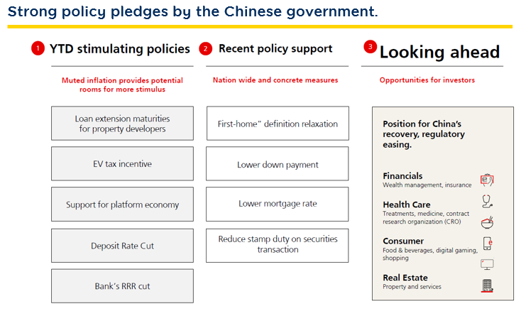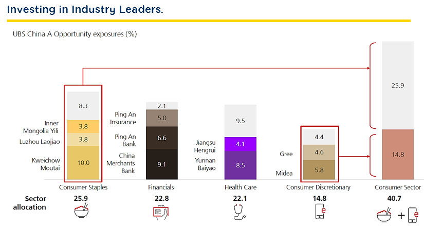 Source: UBS Asset Management as of 31 Aug. 2023.Regarding the stock selection in the Chinese market, UBS Fund is looking for companies that consistently generate high returns, even in challenging market conditions. For example, the fund considers investing in stocks of a company like Kweichow Maotai, a premium liquor manufacturer that has shown strong sales growth despite market volatility. Alternatively, the fund also seeks opportunities for companies that have the potential to expand their market globally, such as NetEase, a leading global online gaming industry, or companies poised to become market leaders in the future. Currently, the Fund emphasizes investments in consumer discretionary, financial sectors including banks and insurance, as well as the healthcare industry. It focuses on companies that have innovative products from their own research and development (R&D) efforts. Source: UBS Asset Management as of 31 Aug. 2023.