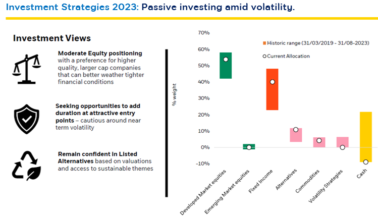 Mr. Mark Fuszard from BlackRock agreed that debt securities are worthwhile investments when interest rates are high. However, the BGF ESG Multi-Asset Fund also maintains a positive outlook on equities investment. This perspective is based on the belief that diversified risk investments across various assets align appropriately with market conditions at different times. In this regard, the fund will have an active and flexible fund management approach to ensure it is well-suited to market conditions in each period. Source: BlackRock as of 31 Aug. 2023. | For illustrative purposes only. There can be no assurances that the positioning of the Fund will be maintained going forward, as market conditions and investment opportunities may be materially different. Weightings do not necessarily represent current or future portfolio holdings.
