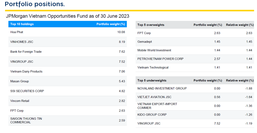 Currently, the fund’s investment portfolio comprises 20 to 30 stocks. Some of the prominent stocks included in the investment portfolio are FPT Corporation, the largest technology company in Vietnam; Mobile World Investment Corporation (MWG), the leading retail and electronics distributor in Vietnam; and Gemadept, a prominent logistics company. The stock selection strategy has enabled JP Morgan to achieve returns greater than the market. Source: J.P. Morgan Asset Management as of 30 Jun. 2023. | Position is relative to MSCI Vietnam IMI Capped Net Return in USD. | Holdings, sector weights, allocations, and leverage, as applicable, are subject to change at the discretion of fund managers.