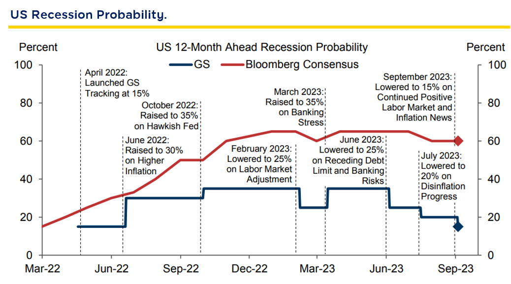 Mr. Kiattisak said the investment landscape has been rather volatile, primarily due to the Federal Reserve's (FED) interest rate decisions aimed at curbing inflation and concerns about a potential economic recession, which led to significant market corrections. However, the latest economic indicators from the Bloomberg Consensus suggest a more optimistic outlook with the decreased unemployment rate which lowers the possibility of the FED raising interest rates. Inflationary pressures have also subsided consistently. Moreover, the GDP growth rate has improved from 1% to 2.1%, and corporate performance has been on the rise since the beginning of the past year. These factors collectively instill confidence that the economy is not heading into a recession as earlier forecast and the stock market has responded positively to these developments. It is thus believed that investment prospects are likely to improve from now on, and the market is less likely to experience heavy corrections. This presents a favorable investment opportunity. Source: Bloomberg, Goldman Sachs Global Investment Research as of 6 Sep. 2023.
