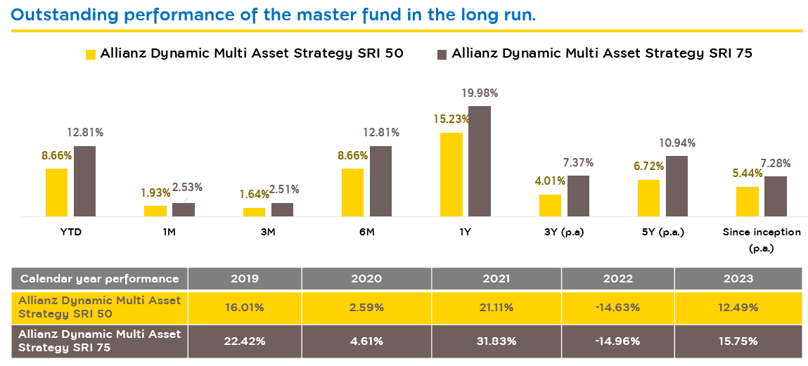- The master funds aim to invest in a broad range of asset classes, with a focus on global equity, fixed income and money market instruments to achieve over the medium-term a performance comparable to a balanced portfolio in accordance with the Sustainable and Responsible Investment (SRI) Strategy.