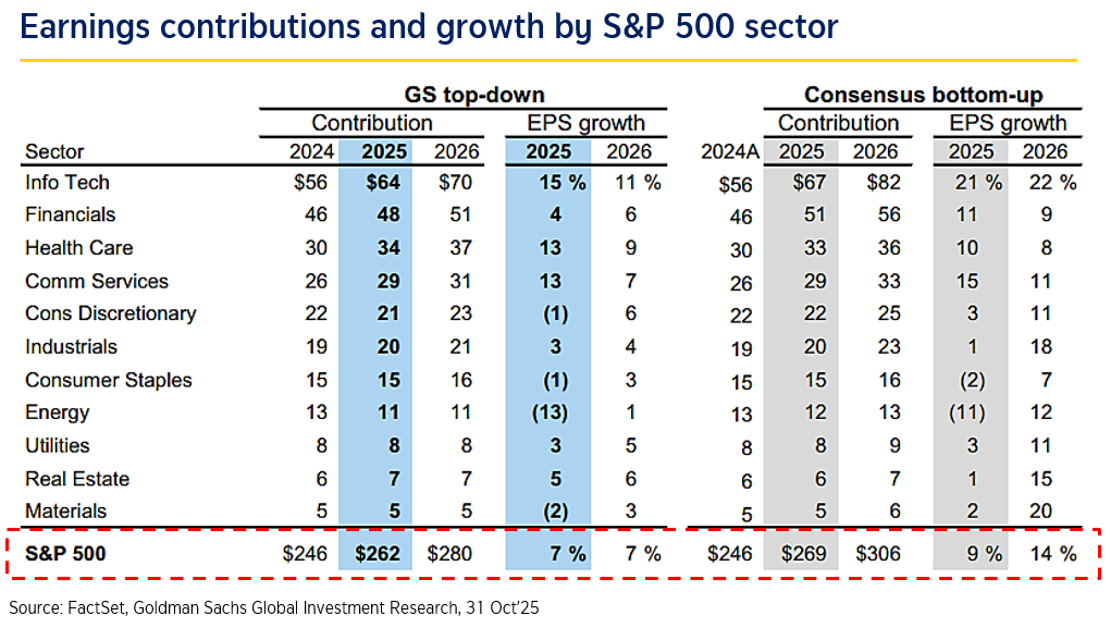 - U.S. equities continue to be well supported by robust economic growth, declining interest rates, and strong corporate earnings. Despite some geopolitical risks, the U.S. GDP is expected to grow by 2.5% in 2026, fueled by large-scale investment in Artificial Intelligence (AI), ongoing fiscal stimulus under the “One Big Beautiful Bill Act,” and looser financial conditions stemming from expected Federal Reserve rate cuts. (Source: Dallas Fed, Revelio Labs, ADP, Bloomberg and Multi Asset Solutions Goldman Sachs, KKP, 10 Oct'25)