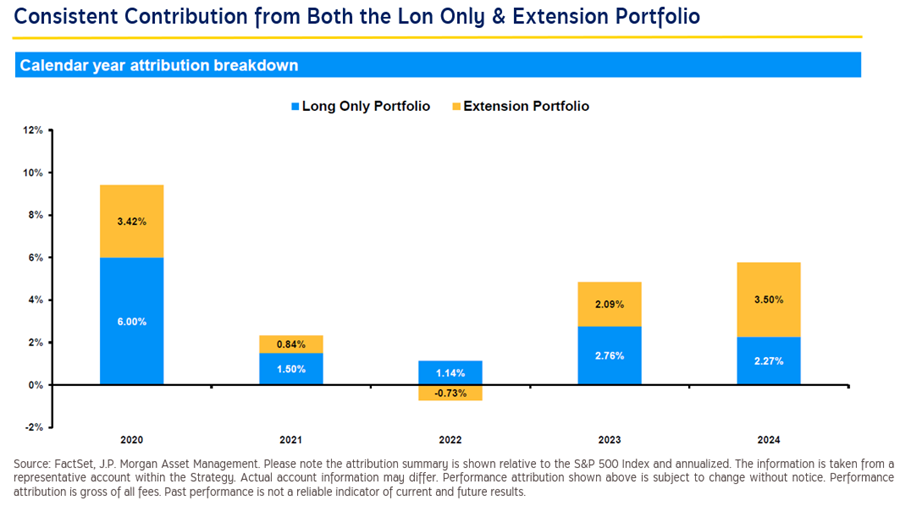 - The US Select Equity Plus Fund employs a “super active” strategy combining both long and short positions to capture returns in varying market conditions. The core long-only portfolio provides steady market exposure, while an extension portfolio tactically combines long and shorts strategies for potential enhance returns. This structure helps maintain consistent alpha generation while controlling overall volatility.