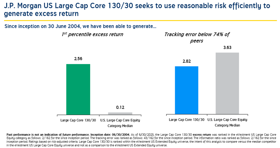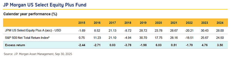 - A proven track record and deep research foundation contributed to the fund’s success. Over the past 20 years, the fund has generated an average annual alpha of 2.5% with low tracking error, supported by a yearly research investment of USD 2.7 million. The Fund’s current positioning reflects high conviction, maintaining overweight exposure to companies with strong growth prospects such as Howmet Aerospace, Mastercard, Lowe’s, Amazon, and Wells Fargo, while holding underweight or reduced positions in names like Tesla, Berkshire Hathaway, Home Depot, and Netflix, where valuations or industry headwinds warrant caution. (Source: J.P. Morgan Asset Management as of 30 Sep’25)
