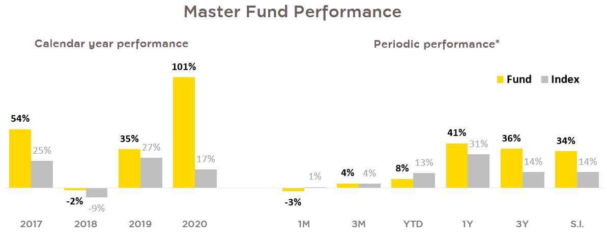 *Returns in period less than one year are not annualized | Source: Baillie Gifford as of 31 Jul. 2021 | US dollars. Net of fees | Index: MSCI ACWI Index | Share Class Inception date: 10 August 2016 | This shows the performance of the master fund, so it is not complied to AIMC’s standard.
