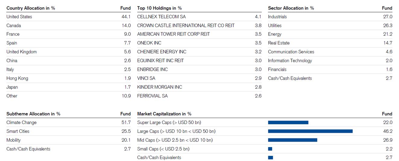 KFINFRARMF and KFINFRASSF invest in Credit Suisse (Lux) Infrastructure Equity Fund which has an investment mix. One of its investments was traditional, large infrastructure stocks whose main income derive from utilities business, transportation and telecommunications- airports, ports, expressways and energy. This acted like investment buffer for less market volatility. The other investment mix was new infrastructure in the new world- 5G, Internet of Things and data centers. The master fund emphasized on firms with certain strategies for long-term growth. Currently, its portfolio overweighs the United States most with 44%. The rest lies in other developed countries in North America, the Europe, Japan as well as China