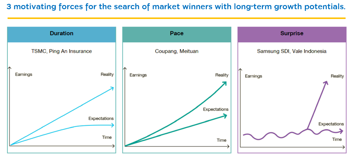 Ms. Jennifer Loeng, an investment specialist from Baillie Gifford Pacific Fund, the master fund of KFHASIA, highlights the factors that have affected the investment climate in Asia, including the COVID-19 crisis, lockdowns, inflation, and rate hikes. However, she believes that once the crisis subsides, there is potential for a quick recovery in the Asia Pacific region. According to her, many companies in the region exhibit various forms of growth potential. For instance, some companies offer the potential for steady, long-term growth, such as China's Ping An insurance company or Taiwan's TSMC semiconductor company. Others, such as China's Meituan or South Korea's Coupang, have the potential to grow at a fast pace. Additionally, there are companies that have exhibited surprise growth, surpassing expectations, such as the South Korean Samsung company, despite being a large company.