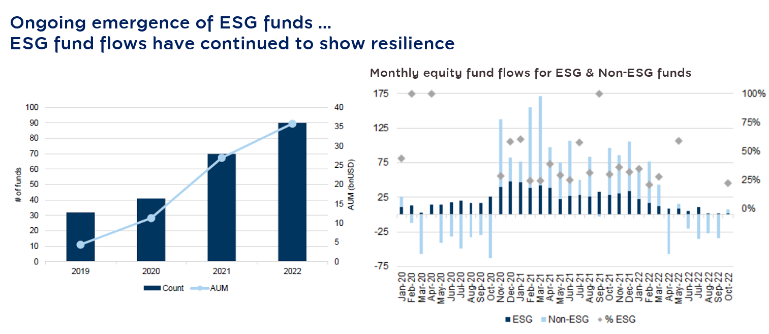 However, it is expected that 2023 will be an important turning point in which various assets will recover, but one must adjust the investment strategy by considering that there are three important investment trends that will increase the chances of generating good returns for the fund: (1) the fund must be highly flexible and dynamic and can be adjusted to suit market conditions, (2) Diversification of investments in a variety of assets is also required, and (3) Most importantly, the investment concept that considered integrating the ESG in the asset selection process. As we can see that ESG is an investment trend that is gaining global attention at a rapid rate; between the years 2019 - 2022, there had been an 8-time increase of fund flow into ESG-minded assets, and the trend continues to grow. Therefore, it is believed that investing in ESG will help the portfolio grow with total and sustainable returns from that concept.