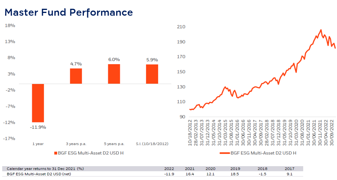 - Minimum 80% of NAV in average of fund accounting year are invested in the Master Fund named, BGF ESG Multi-Asset Fund, Class I2 Hedged USD which managed by BlackRock (Luxembourg) S.A. that follows an asset allocation policy that seeks to maximize total return potentials with investment principal ESG by investing globally in the equities, fixed income transferable securities (which may include some high yield fixed income transferable securities) units of undertakings for collective investment, cash, deposits and money market instruments. | 5 – Medium to high risk | Hedge against currency risk upon fund manager’s discretion.