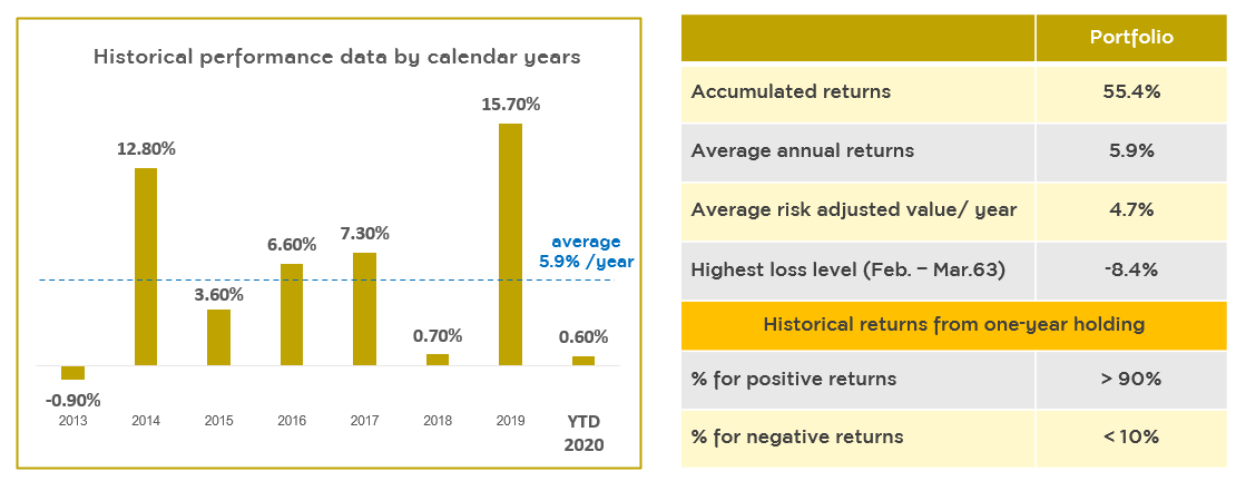 Historical performance data of the investment strategy based on the data of weekly returns during Jan. 2013 – Aug. 2020 in USD currency that is the example of returns generated from the backtest of investment strategy Jan. 2013 – Aug. 2020, which is not the performance of the future result.