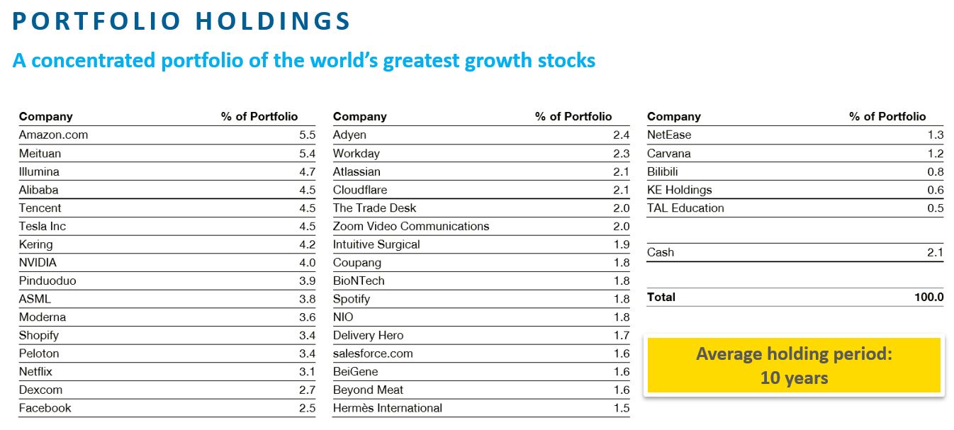 - Focus on a small number of holdings with potentials in which the fund has confidence and that will drive the long-term returns through identifying the exceptional companies based on an analysis of growth potentials that will drive the next decade of returns.