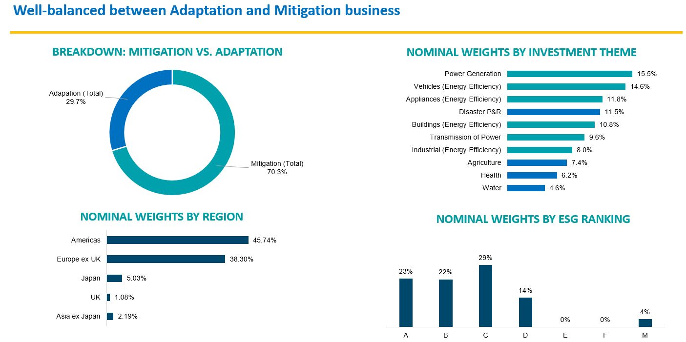 - Actively managed strategy to seek the companies that can mitigate or adapt to climate change, and further optimize through ESG engine