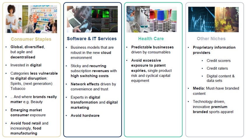 - Focus to invest in hard-to-replicate dominant brands such as consumer staple companies and IT products reaching buyers around the globe despite economic slowdown.