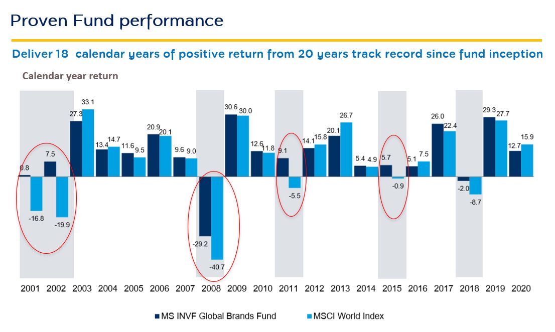 Source: Morgan Stanley Investment Management Limited as of 31 Dec. 2020. | The performance shown belongs to Morgan Stanley Investment Funds - Global Brands Fund, I share class which is the oldest share class incepted on 30 Oct. 2000, while KFGBRANSSF and KFGBRANRMF will invest in ZX and Z share classes incepted on 22 Feb. 2010 and 10 Jun. 2008 . The performance is presented net of investment management fees and are quoted in USD terms. This shows the performance of the master fund, so it is not complied to AIMC's standards.