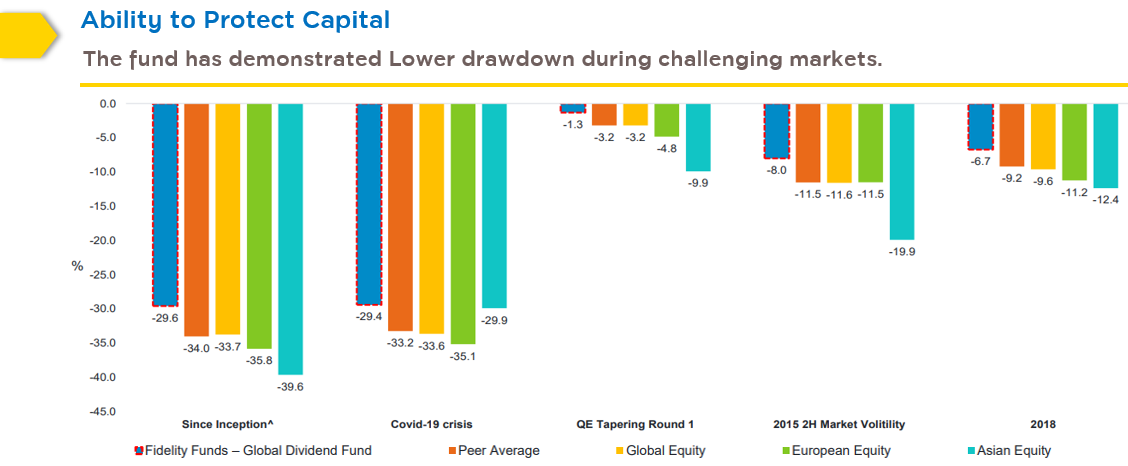 Sources: Top chart: Fidelity International as of 31 Oct 2025; Morningstar Direct as of 12 Dec 2025. Performance shown is based on Share Class Y-QINCOME(G)-USD. Benchmark: MSCI ACWI NR USD. Peer group: Morningstar EAA Fund Global Equity Income. Bottom chart: Source: Morningstar Direct, 31 October 2025. ^ Since Inception refers to the commencement of the A-MINCOME(G)-USD share class (which is 30 January 2012). Covid-19 crisis from 19 Feb 2020 to 30 Mar 2020. QE tapering round 1 from 1 May 2013 to 30 Jun 2013. 2015 2H market volatility from 1 Jun 2015 to 31 Dec 2015. 2018 from 1 Jan 2018 to 31 Dec 2018. Global Equity is MSCI AC World NR index. European Equity is MSCI Europe NR index. Asian Equity is MSCI AC Asia Pacific ex Japan NR index. Peer Average is the Morningstar EAA Fund Global Equity Income. Performance is for the A-MINCOME(G)-USD share class, NAV-NAV (before initial sales charge), in USD terms. The performance shown represents that of the master fund and is not measured in accordance with the performance measurement standards of the Association of Investment Management Companies.