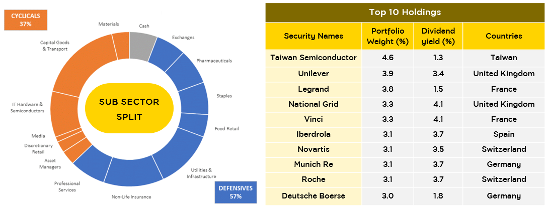 - A flexible, actively managed portfolio combining defensive and opportunistic investment approaches, focusing on companies with strong dividend potential and broad global diversification, unconstrained by benchmark indices. The fund also allocates part of its portfolio to high-quality cyclical stocks to enhance growth potential, while maintaining a strong focus on capital preservation and limiting downside risk through a defensive approach.