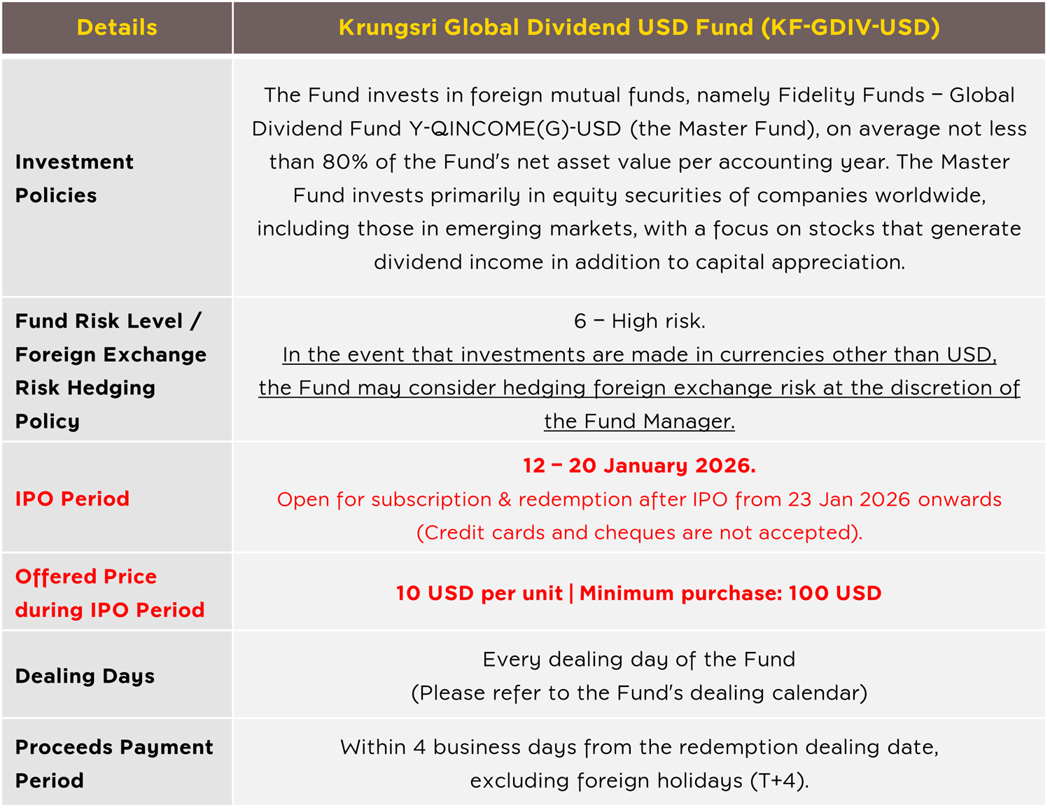- A range of investment options in Fidelity Funds – Global Dividend offered by Krungsri Asset Management.