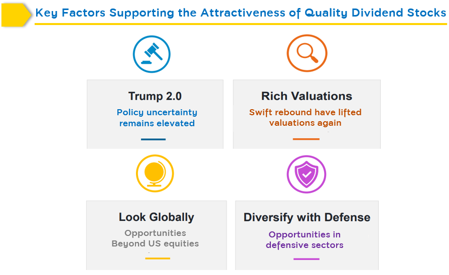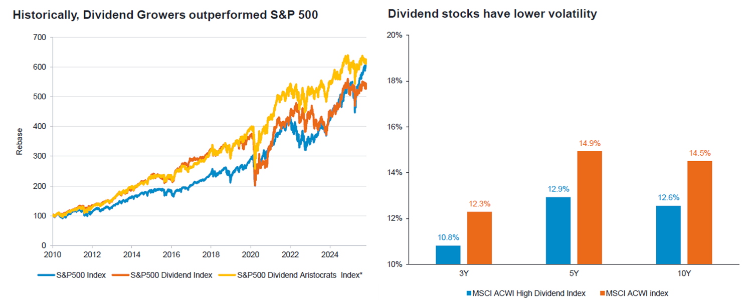 - Building portfolio resilience amidst a changing world order: Dividend investing offers broad diversification across asset classes and regions, providing greater exposure beyond the U.S. market, thereby improving overall risk diversification.