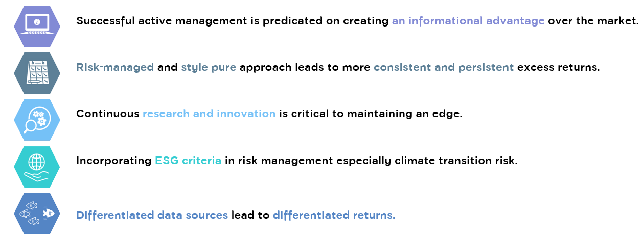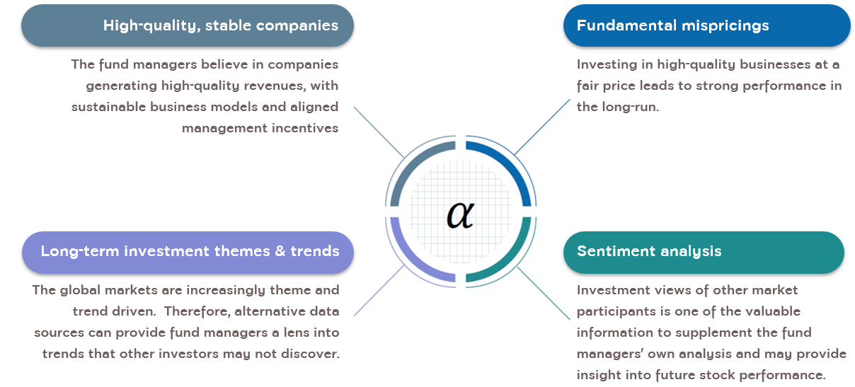 1. Create a superior opportunity to receive return with the advantage of in-depth data: A compilation of data from diverse sources and high-level analytical and data processing techniques from the initial stage of raw data management such as the use of Machine Learning algorithms generate diverse investment views, leading to the creation of an actively managed portfolio that is outstanding and differentiated.