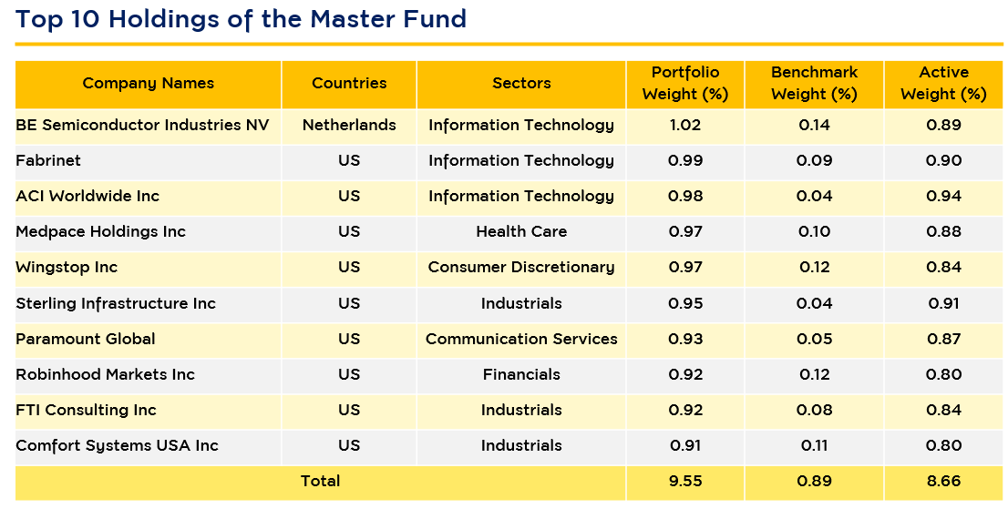 Source: Goldman Sachs Asset Management as of 30 Jun’24. | The benchmark is S&P Developed SmallCap Index. | Peer group average is based on Morningstar Global Small/Mid-Cap Equity. | The return displayed is the net return after deducting related fees. | Dividends are included in the return. | The performance displayed is the performance of the Master Fund which is not in accordance with the mutual fund performance measurement standard prescribed by AIMC.