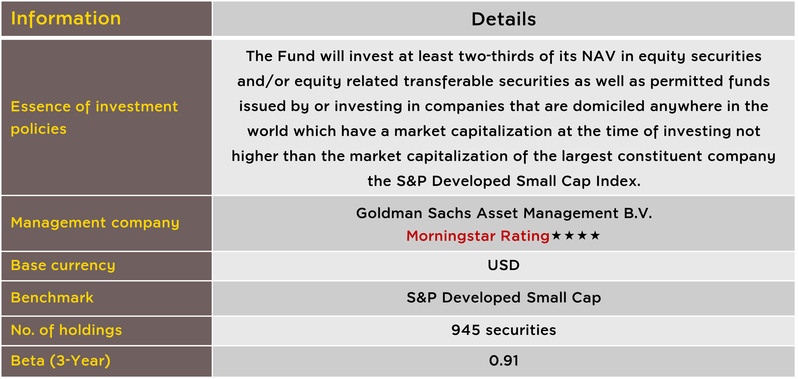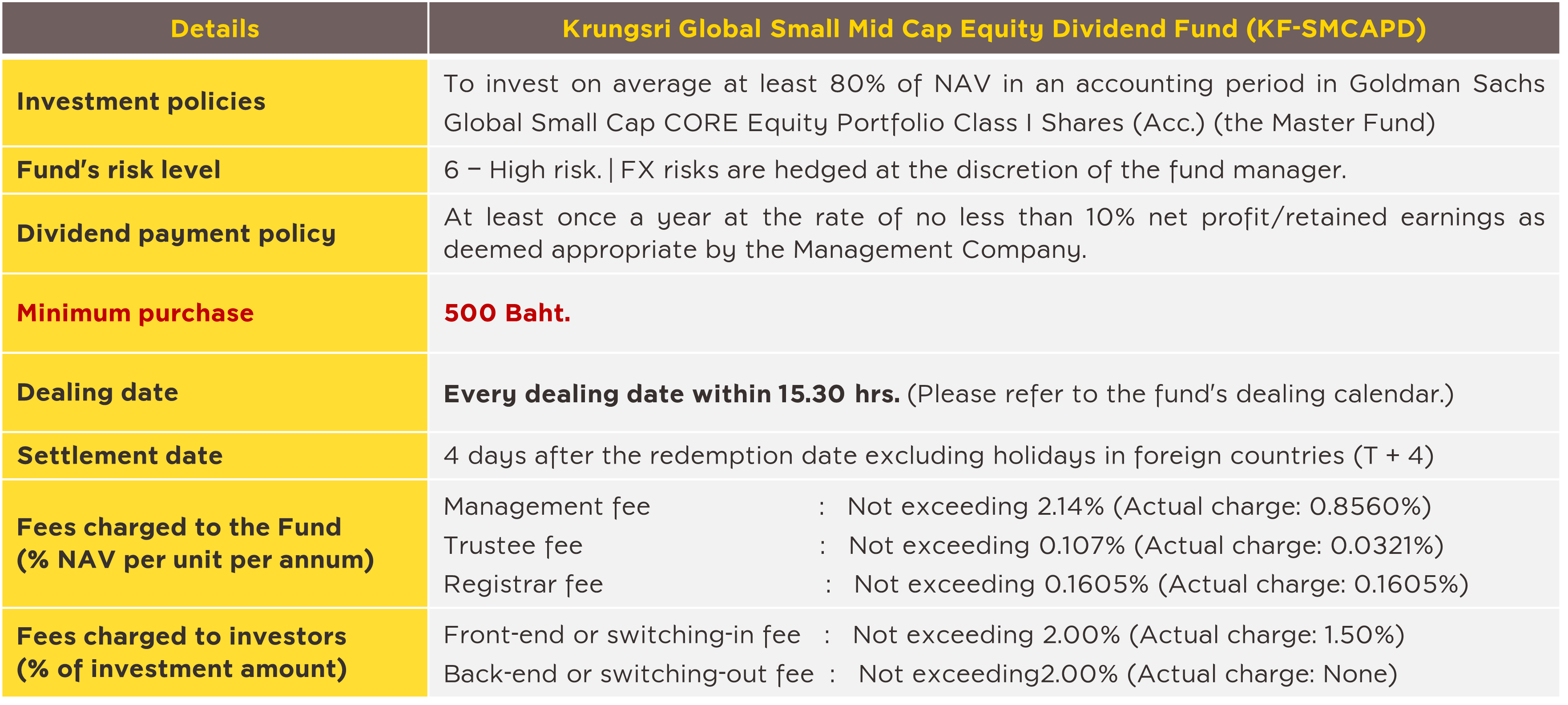 Allow you to access the active portfolio of small-cap but huge-potential stocks with Krungsri Global Small-Mid Cap Equity Dividend Fund (KF-SMCAPD) through the Morningstar 5-star rated Master Fund, Goldman Sachs Global Small Cap CORE Equity Portfolio Class I Shares (Acc.)* which drives investment with the advantage of in-depth data to the creation of an actively managed portfolio that is outstanding and differentiated.