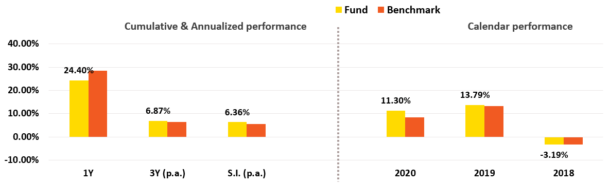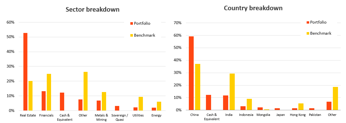 Source: Bloomberg, as of 31 Mar 2021. Inception date: 1 Dec 2017. Performance is shown on a closing bid to bid price basis with income reinvested. Fund performance figures are calculated net of fees. The Fund is actively managed, and the Investment Adviser (IA) has discretion to select the Fund's investments. In doing so, the IA will refer to the ICE BofAML Blended Index: ACCY, 20% LvI4 Cap 3% Constrained Index (the “ICE BofAML Asian $ High Yield Corporate Constrained Blended Index”) when constructing the Fund’s portfolio, and also for risk management purposes to ensure that the active risk (i.e. degree of deviation from the Index) taken by the Fund remains appropriate given the Fund’s investment objective and policy. The IA is not bound by the components or weighting of the Index when selecting investments. The IA may also use its discretion to invest in securities not included in the Index in order to take advantage of specific investment opportunities. However, the geographical scope and credit rating requirements of the investment objective and policy may have the effect of limiting the extent to which the portfolio holdings will deviate from the Index. This shows the performance of the master fund, so it is not complied to AIMC’s standard.
