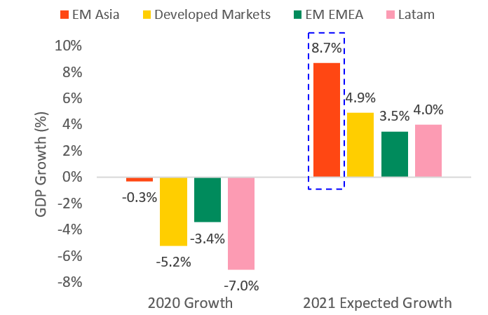 Source: BlackRock as of 31 Mar. 2021 compared with 1) Asian USD high yield bonds that refer to the ICE BofAML Asian Dollar High Yield Corporate Constrained Blended index and 2) Asian Equities that refer to MSCI Asia ex-Japan Index