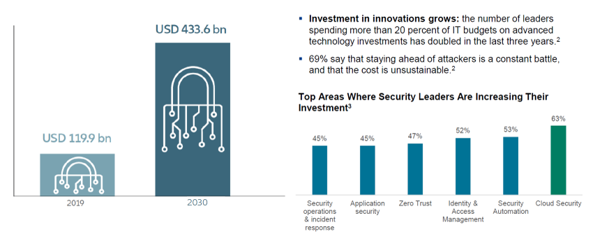 3. Changes in consumer behaviors such as remote works and use of Cloud storage have increased the companies’ spending for better Cyber Security and its market is expected to grow at a rate of 12.6 % p.a. until 20301