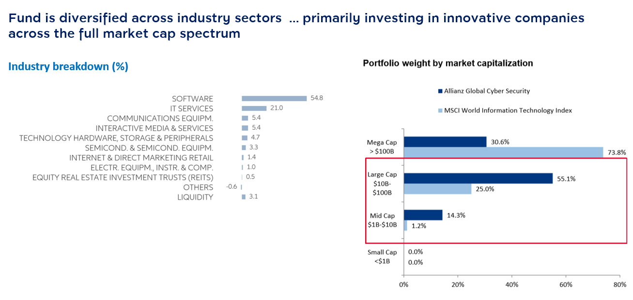 2. Portfolio focusing mostly on pure play stock; companies which are most closely related to the Cyber Security area with broad industry exposure and all cap approach, providing diversified access to the Cyber Security growth story